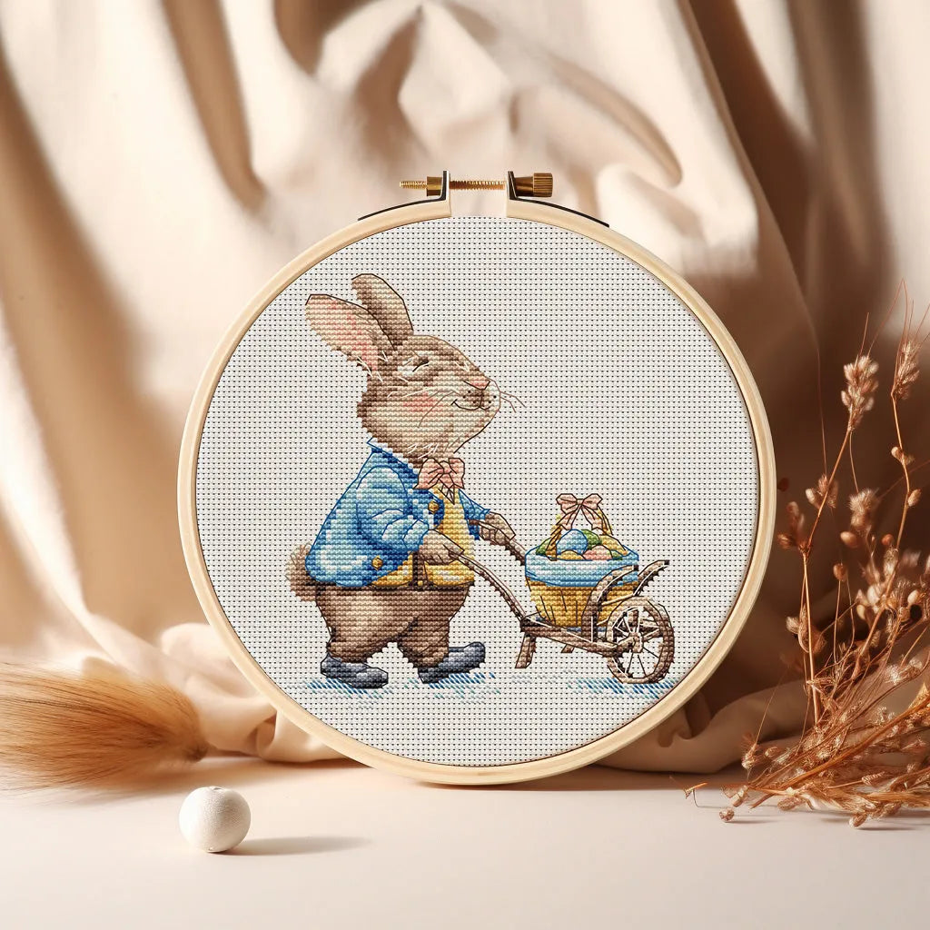 Easter Bunny Cross Stitch Pattern PDF. This adorable bunny, pushing a trolley of colorful eggs, is a whimsical addition to your embroidery chart collection. Instantly download the PDF for a cute and festive animal-themed decor or a heartwarming Easter gift. A delightful Easter DIY project.