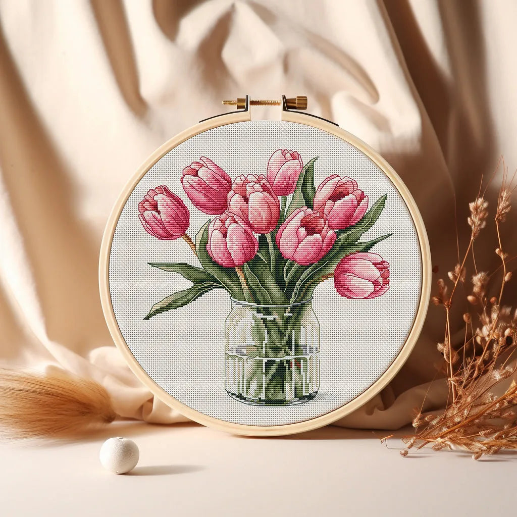 Pink Tulip Bouquet captured in Counted Cross Stitch Chart PDF. Adorn your space with the charm of delicate pink flowers in a glass vase, meticulously crafted in this Floral Bouquet Embroidery Design. Stitch your way to a captivating masterpiece, encapsulating the beauty of a blooming floral arrangement.