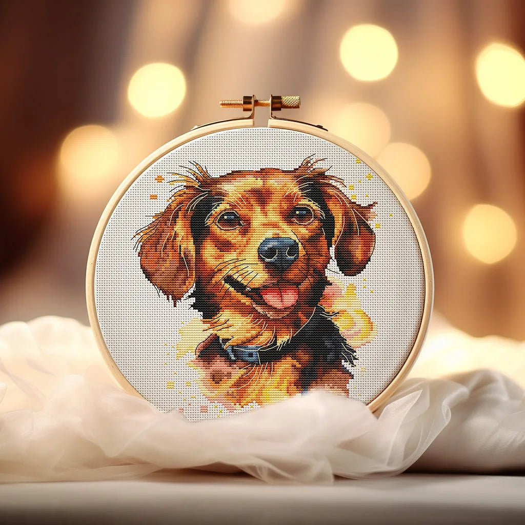 Modern cross-stitch pattern featuring a charming watercolor dog portrait. This animal embroidery showcases a funny, smiling Chiweenie puppy, a delightful mixed-breed combining the best of Miniature Dachshund and Chihuahua breeds. Embrace this cross-stitching design for a heartwarming project capturing the essence of this lovable canine companion.