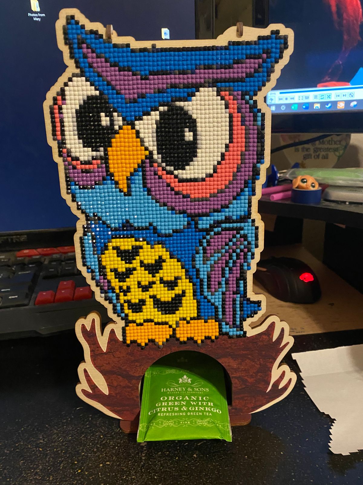 The kit contains: plywood base of Owl, double-sided adhesive, set of acrylic rhinestones in zip lock bags, pen, tray, string, silicone gel, instructions.