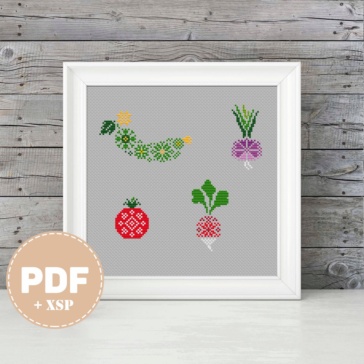 Cucumber 60 * 32 stitches, onion 19 * 41 stitches, tomato 21 * 26 stitches, radish 45 * 23 stitches