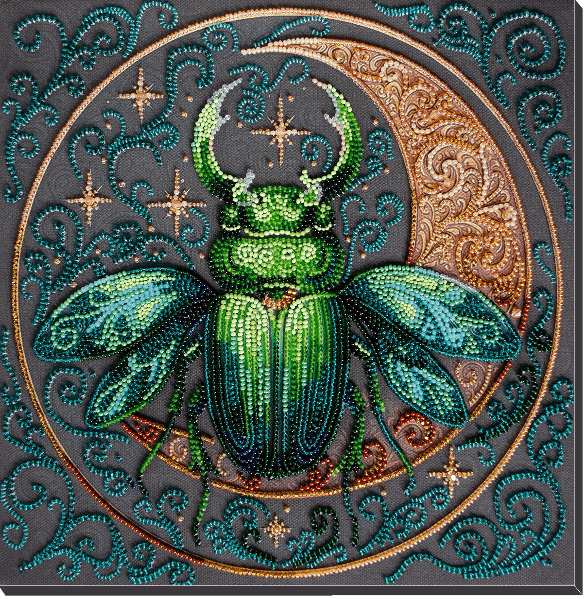 The set is additionally completed with Preciosa beads No. 13 - microbeads - 4 colors, a needle for embroidery with microbeads and decorative stones (glass) in the shape of a bicone - 11 pieces. The possibility of gallery decoration of the embroidered picture is provided (without a baguette, without a passe-partout).
